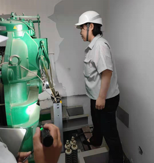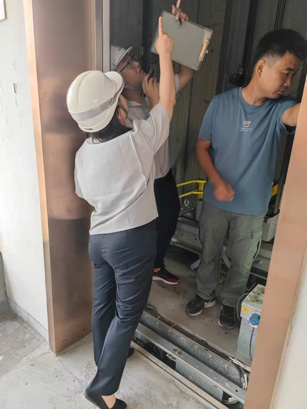 為了保證工作扎實(shí)開展,鼓勵(lì)一線員工,7月30日,院公司王楠楠副總經(jīng)理到達(dá)現(xiàn)場(chǎng)帶班檢驗(yàn)。從資料審查開始,檢照明、試通話、進(jìn)機(jī)房、查井道、看底坑,帶班參與了全過(guò)程檢驗(yàn)。檢驗(yàn)過(guò)程中,王總還仔細(xì)了解了有關(guān)檢驗(yàn)程序和技術(shù)要求,親自查看了曳引機(jī)、限速器等運(yùn)行和動(dòng)作情況,參與了鋼絲繩、轎頂、底坑、轎底等部位的檢驗(yàn)。